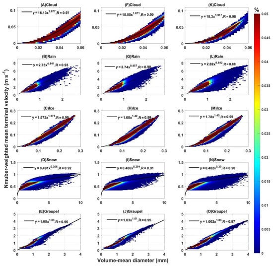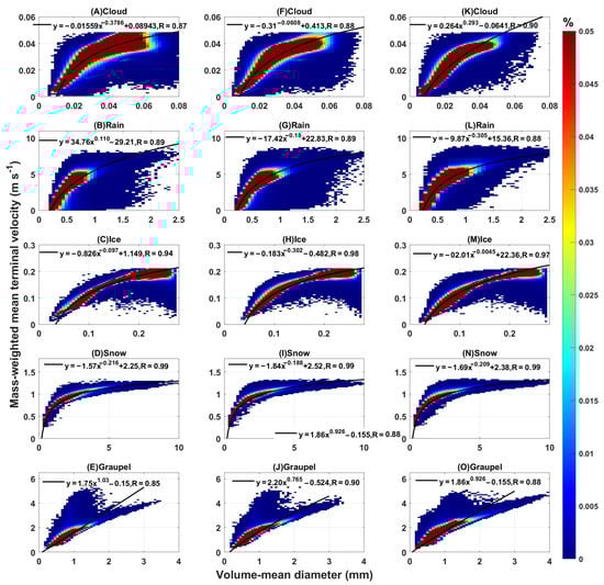 Modern bulk microphysics in mesoscale models and climate models typically uses the mass-weighted mean terminal velocity of different hydrometeors for the description of sedimentation []. In this paper, the hydrometeors are assumed as spherical particles, and the equivalent volume-mean diameter is calculated using their mass and density. For each selected voxel as listed in Table 1, the mass-weighted mean terminal velocity and volume-mean diameter of the group of particles within the given voxel were calculated for all types of hydrometeors. Then the joint probability density function of the relationship between Vm and Dv are presented in Figure 1. A larger volume-mean diameter means a greater mass of the hydrometeors, therefore greater mass-weighted mean terminal velocity. It shows that there is a positive correlation between mass-weighted mean terminal velocity and volume-mean diameter (Figure 1) for all types of hydrometeors. The correlation coefficients R are greater than 0.8.