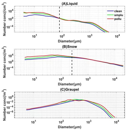 Size distribution of (A) cloud droplets/raindrops, (B) ice crystals/snow, and (C) graupel particles in clean (blue solid line), moderate pollution (green solid line), and polluted (red solid line). The black dashed line is the threshold of (A) cloud droplets/raindrops (80 μm) and (B) ice crystals/snow (250 μm).