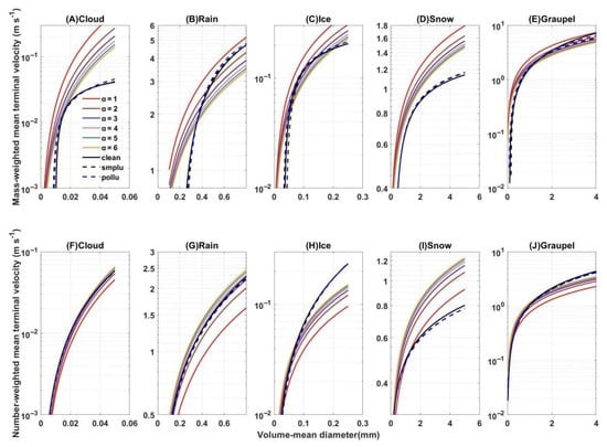 Mass-weighted (top) and number-weighted mean terminal velocity (below) of different hydrometeors as a function of volume-mean diameter when assuming the shape parameters as a different fixed value (colored solid line) and using clean (solid black line), moderate pollution (smplu, black dashed line), and polluted (pollu, blue dashed line) parametrizations: (A,F) cloud droplets, (B,G) raindrops, (C,H) ice crystals, (D,I) snow, and (E,J) graupel.