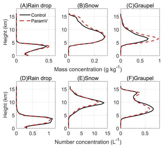 According to Figure 5, it can be found that due to the decreasing Vm of the raindrops, sedimentation is inhibited, resulting in an increased mass concentration of the raindrops. The Vn of raindrops increases, which reduces the concentrations at different altitudes. Snow can exist from 4 km at lower levels to 15 km in the upper troposphere. With decreased Vm in the ParamV experiment, the settlement slows, resulting in the mass concentration of snow increasing at higher altitudes (8–15 km), and only changing slightly at lower altitudes (0–8 km). Snow sedimentation is faster with increased Vn, resulting in smaller number concentrations. A similar trend can be found for graupels. At higher altitudes (11–15 km), the increase of Vn for graupel may enhance the collection of ice crystals, leading to a reduced number concentration of ice crystals. The results show that using the modified parametric scheme of Vm and Vn increases the average mass concentration of raindrops, snow, and graupel, and the total amount of all precipitation particles in the whole cloud area increases accordingly, which is consistent with the research results of Tao et al. [].