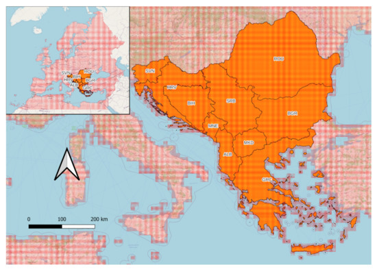 This research focuses on the south-eastern part of the European continent, given its high potential for agricultural productivity and location in a transitional zone in terms of climatic change. The considered ten territories (Figure 1) involve Albania (ALB), Bosnia and Herzegovina (BIH), Bulgaria (BGR), Croatia (HRV), Greece (GRC), Montenegro (MNE), North Macedonia (MKD), Romania (ROU), Serbia (SRB) and Slovenia (SVN).