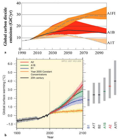 - IPCC. Special Report on Emissions Scenarios. In Intergovernmental Panel on Climate Change Special Reports on Climate Change; Cambridge University Press: Cambridge, UK, 2000; p. 570. [Google Scholar]