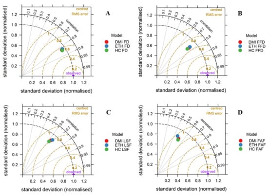 Models’ performance by Taylor diagrams for Frost Days (A), Free of Frost Days period (B), Last Spring Frost (C) and First Autumn Frost (D) calculations.