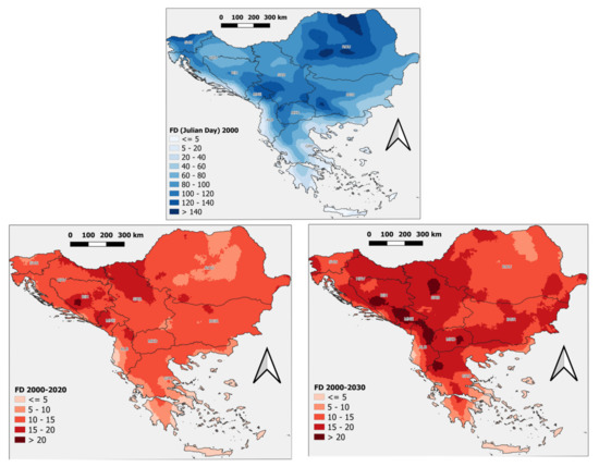 More specifically, a longer free of frost period or shorter duration of the frost period (between later first fall frost and earlier last spring frost) with a decline in the frequency of frost days is expected for Serbia [58,59,60,61]. A decrease in the number of frost days is projected for Montenegro [21,62]. A general reduction of the frost days, the night frost days, the increase of the free frost period and the reduction in the frequency of frost days are anticipated for Greece [39,63,64,65,66]. Albania is also predicted to be exposed to a lesser amount of frost days [67], while both increases and decreases in the number of frost days are visible for the future in Romania [68,69].