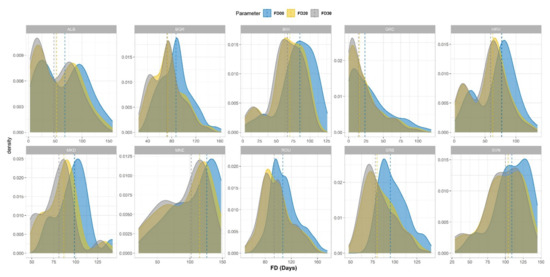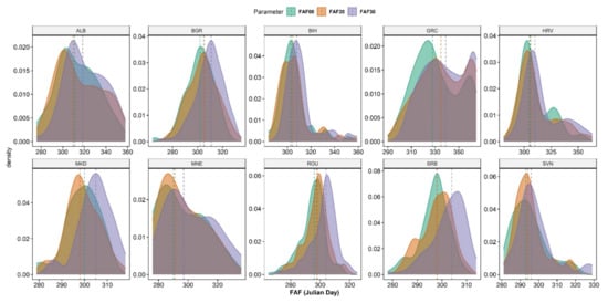 In Figure 9, the density plots of the FAF per time horizon and per country are displayed, and in Table 1, the medians of these distributions are listed. It is worth noting that in most countries, the median is becoming lower from the RP to the H2020; after that, to the H2030, there is a slight increase. Specifically, in the case of Romania, the FAF median is 97 for the reference period, becomes equal to 93 for the H2020 and then returns to 97 Julian days for the H2030.