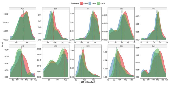 It is evident that most kernel density distributions are unimodal (with one major pick) except for Montenegro (MNE), Slovenia (SVN) and Greece (GRC). The bimodal distribution is formed owing to the country’s geography, which forms two (almost) distinct LSF regimes, one caused by the high-altitude areas and the other caused by the lowlands or the warmest areas.