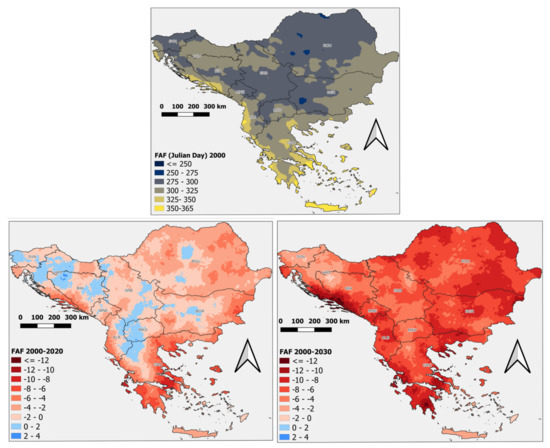 The image depicting the difference between the H2000 and the H2020 (Figure 8, left down) reveals that most of the study area is under negative values. This means that the FAF value is becoming higher from the H2000 to the H2020. Thus, the evolution of the areas under this regime indicates an extension of the growing season due to climate change. The areas expected to be subjected to this characteristic evolution involve the coastal countries, particularly Greece and the Adriatic shoreline of Albania and Croatia, along with the lowland of the examined countries.