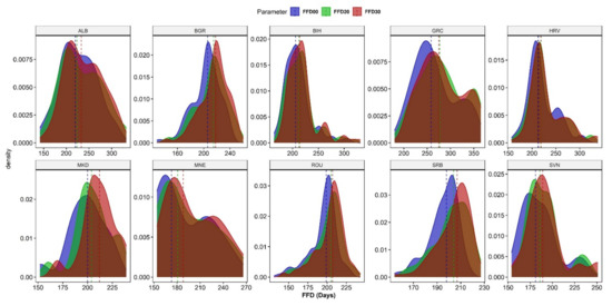 A high reduction is recorded over Albania, from a median of 68 FDs at the reference period to 52.5 in 2020 and 47.5 in the H2030, indicating a reduction of 22.8% and 30.1% (Table 2), respectively. The kernel density plot of Albania (ALB) indicates a bimodal variation of FD over the country, revealing the frost days’ regime contrast between mountainous and coastal Albania.
