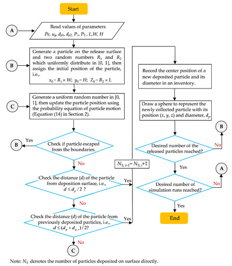 In the Monte Carlo simulations, the particles were sequentially released from the release surface y = H, and the x and z coordinates of the particle were chosen randomly using a uniform random number generator. Once the initial position of an approaching particle was determined, its trajectory could be obtained from the motion probability given by Equation (14). When the particle moved out of the sidewalls of the box, periodic boundary conditions were invoked. When the distance between the center of the particle and the deposition surface was less than a particle radius or when the distance between the approaching particle and any deposited particles was less than the sum of the two particles’ radii, the particle was considered to be deposited. A more detailed description of the simulation procedure can be seen from the flow chart (Figure 2).