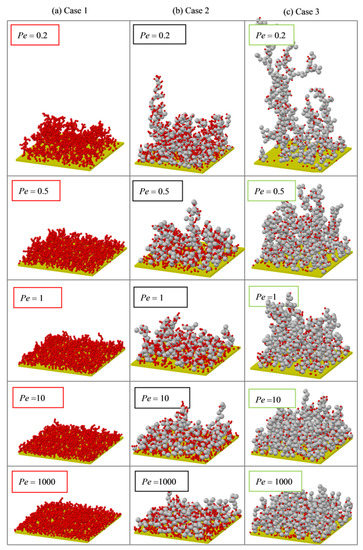 Deposition morphologies at different Pe for three kinds of particle size distributions: (a) Case 1; (b) Case 2; and (c) Case 3.