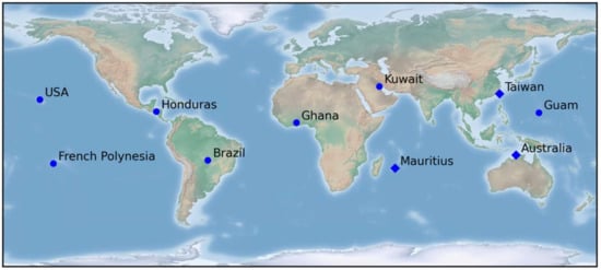 A network of 10 downlink ground stations located in Australia, Brazil, French Polynesia, Ghana, Guam, Hawaii, Honduras, Kuwait, Mauritius, and Taiwan receives downlink telemetry and routes the data to the National Space Organization (NSPO) and University Corporation for Atmospheric Research (UCAR) data processing centers. The sites in Taiwan, Australia, and Mauritius are capable of uplink/commanding. A map is given in Figure 1. The network is designed to enable frequent downlinking of COSMIC-2 data in order to meet the mission data product median latency requirements of 45 min and 30 min for neutral atmosphere and ionosphere products, respectively.