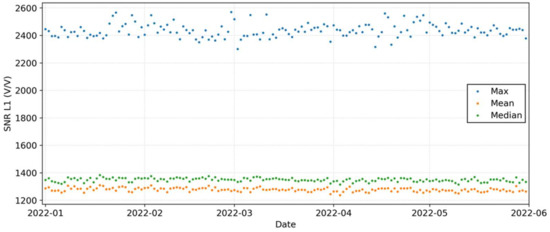 A key feature of the TGRS is a pair of high-gain phased array antennas for RO tracking. This enables higher SNR RO profiles than any other mission to date. Figure 3 shows the daily max, mean, and median SNR in the range of 60–80 km height of straight line (HSL). The average of the daily mean and max SNR is 1277 V/V and 2437 V/V, respectively. For comparison, the mean SNR achieved by COSMIC-1 is approximately 700 V/V [34]. Higher SNR mainly enables the receiver to track signals lower into the troposphere. In fact, COSMIC-2 is configured to track setting profiles to −350 km HSL which enables the reliable detection of tropospheric ducts. In future, detected ducts may be flagged in order to provide more information to data users [1,34].