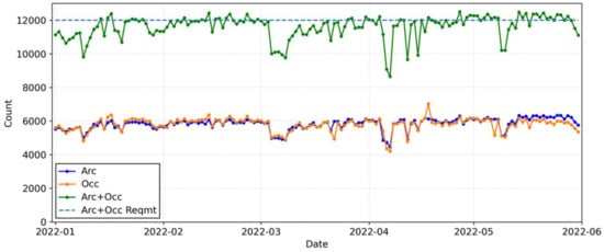 TGRS ionosphere product quantity is measured as the number of daily TEC arcs and occultations. A TEC arc and occultation are defined as the portion of a track above and below the spacecraft local level, respectively. An occultation must span from 90 km straight-line altitude to spacecraft altitude in order to be counted. A key requirement related to TEC is that the daily sum of the arcs and occultations should be at least 12,000. Figure 4 shows TEC arcs, occultations, and their sum in 2022. The arc plus occultation requirement has not been consistently met since launch. This has driven significant TGRS and ground processing software improvements and detailed investigation of potential future improvements.