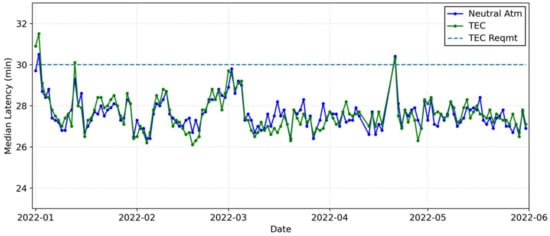 As mentioned previously, the mission’s data product latency requirements drive the implementation of a 10-downlink-station network. Since the addition of the 10th station at Tahiti on 3 January 2022, the latency of both the neutral atmosphere and TEC products exceed requirements on nearly all days, as shown in Figure 5. The time series show the daily median of all computed latency values. The latency values are computed from every 10th 1 s observation epoch in a neutral atmosphere profile or TEC track to the product creation time. This measure includes on-orbit storage time, downlink and transfer to the DPC, and processing time.