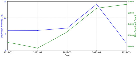 COSMIC-2 data and products may be downloaded from CDAAC and CWB [29,30]. Figure 6 below shows the monthly volume and number of files downloaded from the CDAAC public interface in 2022. Data and products are published as one daily compressed tar file per file type. On average, 9.7 TB and 23187 files were downloaded each month.