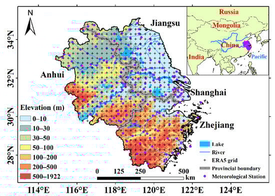 The YRD region is located between 115–123° E and 27–35° N in eastern China and consists of the Shanghai municipality as well as Zhejiang, Jiangsu, and Anhui provinces (Figure 1). The YRD has an area of 3.58 × 105 km2, accounting for ~3.7% of China’s land area, and has 227 million permanent residents, accounting for 16% of China’s total population []. The YRD is one of the regions with the highest population density, most active economic development, and highest degree of openness in China []. The YRD region has an annual total precipitation of 1000–1600 mm and an annual mean temperature of 14–18 °C and is prone to the East Asian summer monsoon []. Any anomalous variation in precipitation, especially extreme precipitation, might cause serious threats to urban food security, the safety of property and life, and social stability [].