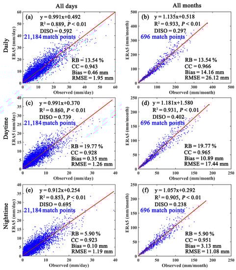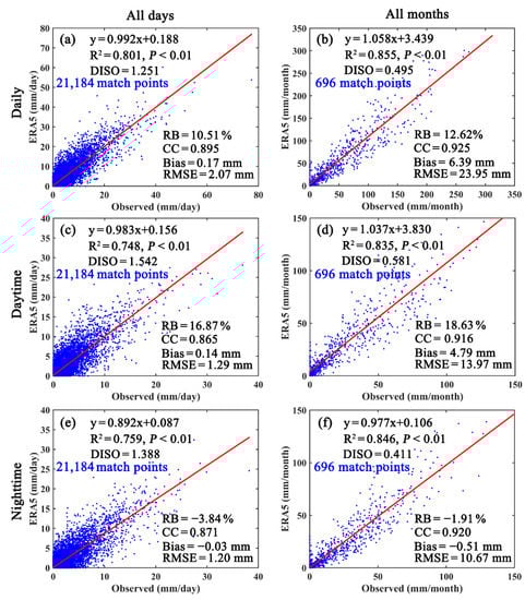Scatterplot of daily (a,b), daytime (c,d), and nighttime (e,f) precipitation from surface observational stations and their corresponding ERA5 grid points in the YRD for the period 1961–2018. The left (right) column represents all-day (all-month) values, and solid red lines denote linear regression lines. The 21,184 and 696 matching points on the all-day and all-month scales represent the temporal comparisons over 21 and 184 days and 696 months, respectively.