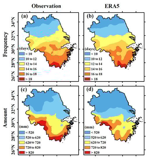 The spatial distribution of the annual mean extreme precipitation frequency and amount in the YRD for the period 1961–2018 were investigated in observational and ERA5 data (Figure 4). As shown in Figure 4a, the annual extreme precipitation frequency in the observational data displayed an evident south–north gradient, with high values in the south (>16 days) and low values in the north (<10 days). The western parts of the study area (mountainous region) also showed relatively high values (14–16 days). The spatial distribution of extreme precipitation frequency had not only a zonal differentiation but also appeared to have a high elevation dependence. Similar spatial patterns were found in the ERA5 data (Figure 4b). The spatial distribution of the annual mean extreme precipitation amount in the observational data also had a clear south–north gradient, decreasing from >720 mm in the south to <520 mm in the north (Figure 4c). The areas with high values of extreme precipitation were mainly distributed in the southern and southwestern edge of the YRD region. Similar spatial characteristics of extreme precipitation amounts were also found in the ERA5 data, but the specific values were slightly smaller than the observational data (Figure 4d).