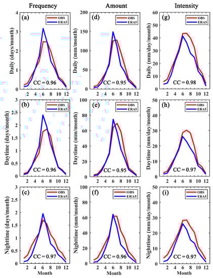 Seasonal cycles of extreme precipitation frequency (a–c), amount (d–f), and intensity (g–i) in observations (OBS, red) and their corresponding ERA5 grid points (blue) at the daily, daytime, and nighttime scales (top, middle, and bottom rows, respectively). CC denotes correlation coefficient.