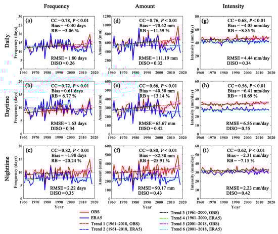 Time series of the annual extreme precipitation frequency (a–c), amount (d–f), and intensity (g–i) in the observational stations (red) and their corresponding ERA5 grid points (blue) reanalysis data at the daily, daytime, and nighttime scales (left, middle, and right columns, respectively).