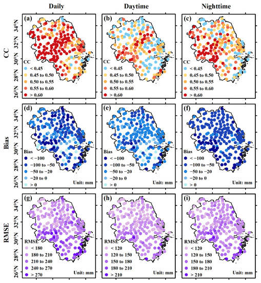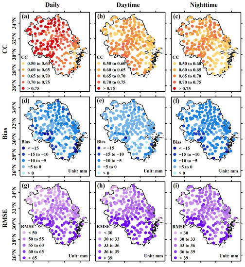 Correlation coefficient (CC) (a–c), Bias (d–f), and RMSE (g–i) between the yearly time series of precipitation amount data of stations and their corresponding ERA5 grid points at the daily, daytime, and nighttime scales (left, middle, and right panels, respectively) for the period 1961–2018 in the YRD.