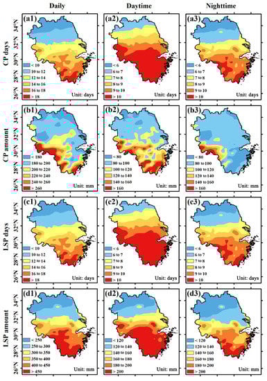 The annual mean convective precipitation days at the daily scale showed an evident south–north gradient, decreasing from the south (>16 days) to the north (<10 days) (Figure 9(a1)). The mean convective precipitation days at daytime and nighttime scales also exhibited similar patterns to those at the daily scale. However, their numbers of days were slightly lower, ranging from >10 days in the south to <6 days in the northern parts of the YRD (Figure 9(a2,a3)). It should be noted that the daytime and nighttime conditions here could not be directly compared because the numerical values of extreme precipitation thresholds were different. The distribution of large-scale precipitation days was almost the same as that of convective precipitation days (Figure 9(c1–c3)) because almost every extreme precipitation event in ERA5 included convective and large-scale precipitation processes. For extreme precipitation amounts, the high values of convective precipitation (>260 mm) at the daily scale were located in the southwestern part of the study area, whereas the low values (<200 mm) were in the north and eastern parts of the YRD (Figure 9(b1)). The values of daytime convective precipitation were greater than those during nighttime in the southern part of the study area (Figure 9(b2,b3)). Large-scale precipitation also had a similar spatial distribution, with high values in the south, low values in the north, and higher values during daytime than those during nighttime (Figure 9(d1–d3)).