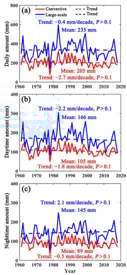 Time series of convective and large-scale precipitation amounts at daily (a), daytime (b), and nighttime (c) scales for the period 1961–2018 in the YRD.