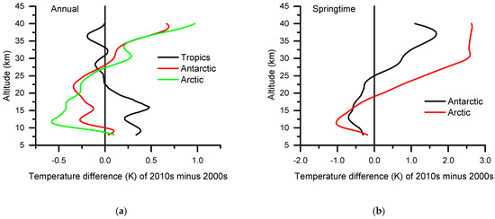 (a,b): Altitude profiles of the temperature differences at altitudes of 8–40 km of the 2010s (2010–2020) minus the 2000s (2002–2010) for the annual tropics (30° S–30° N), annual and springtime Antarctic (60°–90° S) and Arctic (60°–90° N).