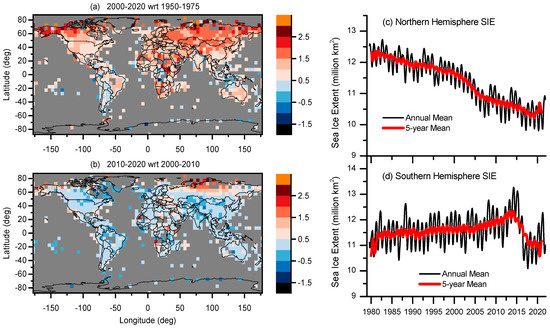 (a,b): Maps for global land surface air temperature differences of 2000–2020 minus 1950–1975 and 2010–2020 minus 2000–2010. (c,d): Time series sea ice extent (SIE) in the Southern Hemisphere (SH) and Northern Hemisphere (NH) during 1979–2022.