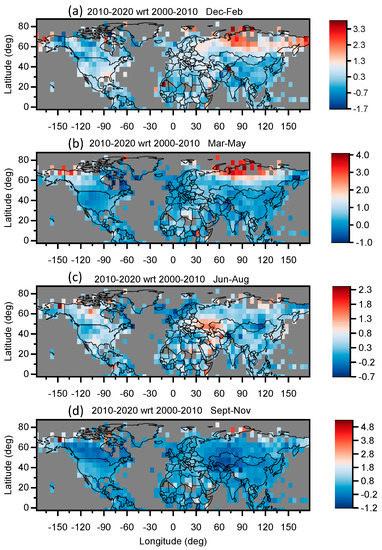 (a–d): Maps for seasonal NH land surface air temperature differences of 2010–2020 minus 2000–2010 in DJF, MAM, JJA and SON.