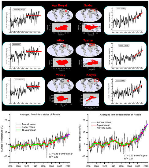 (Upper panel) Time-series annual surface temperatures of three representative inland states (Aga Buryat, Altay and Yevrey) that have no sea-ice melting versus three representative coastal states or observation stations (Sakha, Taymyr and Koryak) in which sea-ice melting occurs in Russia (the red lines roughly showing the change trends). (Lower panel) Time-series annual, 5-year and 10-year mean surface temperatures averaged from the 39 inland states or stations with no sea-ice melting versus the 12 coastal states or stations in which sea-ice melting occurs in Russia (see the text), where linear fits to the observed data after 2000 are given (the violet lines), with the slopes ΔTs (changed temperatures per year) and the R2 (COD) values indicated.