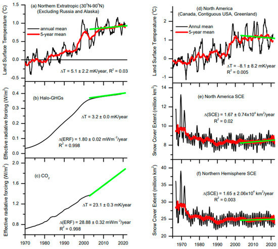 (a): Time-series measured land surface air temperature at Northern Hemisphere (NH) extratropic (30° N–90° N) excluding Russia and Alaska. (b,c): Time-series calculated effective radiative forcings (ERFs) of atmospheric CO2 and halogenated greenhouse gases (halo-GHGs), given in climate models [5,8]. (d): Time-series measured surface temperatures in North America (Canada, contiguous USA and Greenland). (e,f): Time-series snow cover extent (SCE) in North America and NH during 1968–2021. For each dataset in (a–f), a linear fit to the observed data after 2005 is given (the green line), with the slope (changed amount per year) and the R2 (COD) value indicated.