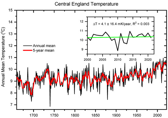Annual and 5-year mean temperature of the central England representative of a roughly triangular area of the United Kingdom enclosed by Lancashire, London and Bristol for the period of 1659–2021, which is the longest instrumental record of temperature in the world. The inset shows annual temperatures in 2000–2021 (the black curve) and a linear fit to the observed data (the green line), with the slope ΔT (changed temperature per year) and R2 value indicated.