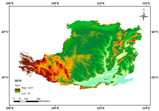 The Loess Plateau (100°54′–114°33′ E, 33°43′–41°16′ N) is located in central and western China, covering an area of about 640,000 km2 (Figure 1). The Loess Plateau is a semi-arid temperate continental monsoon climate, with a cold, dry, and windy winter and spring, and a hot and rainy summer and autumn. The annual average temperature ranges between 4.3 to 14.3 °C [], and the mean annual temperature varies greatly from year to year, and the temperature difference between the east and the west is significant. The mean annual precipitation ranges between 200 mm in the northwest to 750 mm in the southeast, being heterogeneous with regard to space, and about 60–70% of the total annual precipitation occurs in the rainy season during June to September []. Due to low vegetation coverage and serious water and soil loss, the Loess Plateau is one of the areas that faces extreme water and soil loss and has a very poor ecological environment in China and even in the world.