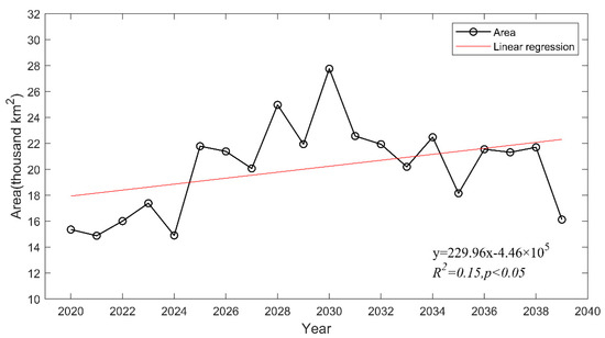Figure 3 illustrates the changes of the impacted area under the 1.5 global warming level. The annual areal coverage of extreme precipitation events on the Loess Plateau are projected from 14.2 × 103 km2 to 28.1 × 103 km2. The figure shows that in 2030, the largest area would be impacted (i.e., 28.1 × 103 km2), and the lowest area in 2024 (i.e., 14.2 × 103 km2).