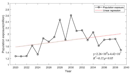The annual population exposure to extreme precipitation events under the 1.5 °C global warming level was projected from 1.32 × 106 to 2.68 × 106 person-year. Although the frequency of extreme precipitation events in the Loess Plateau was likely to increase under the 1.5 °C global warming level, the population of the Loess Plateau will not increase indefinitely. Figure 5 illustrates the exposure of the population to extreme precipitation events on Loess Plateau that is likely to reach its peak around 2030 and, after that, it is likely to decline gradually.