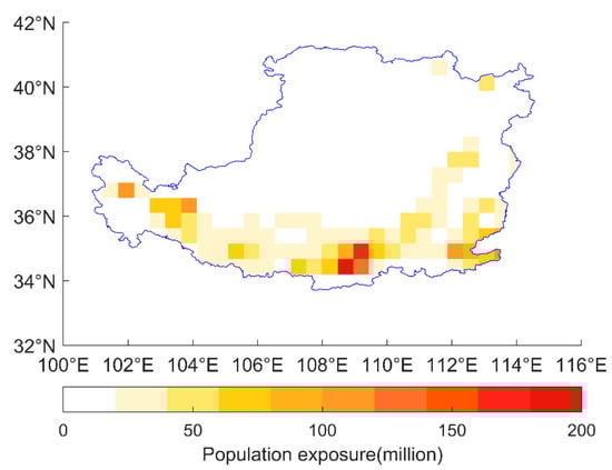 Figure 6 shows that the spatial distribution of average annual population exposure to extreme precipitation events on the Loess Plateau with reference to the 1.5 °C global warming scenario (Figure 6), the population exposure of eastern and southern regions of the Loess Plateau is significantly higher than that of the northern region, because the northern region of the Loess Plateau is sparsely populated. The cities having high population exposure are Lanzhou, Xining, and Xi’an, respectively, the areas being provincial capitals having a large population. The largest population that is exposed to extreme precipitation is that of Xi’an, which exceeded 10 million in 2020, and hence has the highest exposure as compared to any city on the Loess Plateau. Areas having low population exposure lie in the northern part of the Loess Plateau, in which the population density is low and the frequency of extreme precipitation events is also low.