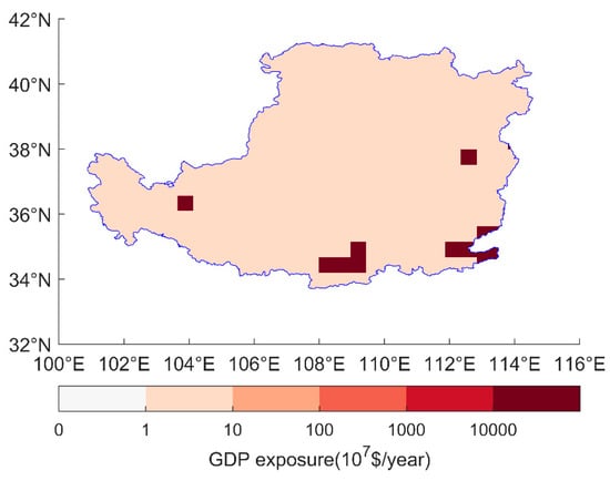 According to the spatial distribution of the GDP exposure of extreme precipitation events on the Loess Plateau (Figure 8), it is expected to be much higher in cities having high GDP, which is consistent with the spatial distribution of population exposure in Zhengzhou, Xi’an, Taiyuan, and Lanzhou. The average annual GDP exposure of the above areas exceeds USD 100 billion. The GDP exposure of other regions of the Loess Plateau range from 1 × 107 to 10 × 107 billion USD per year.