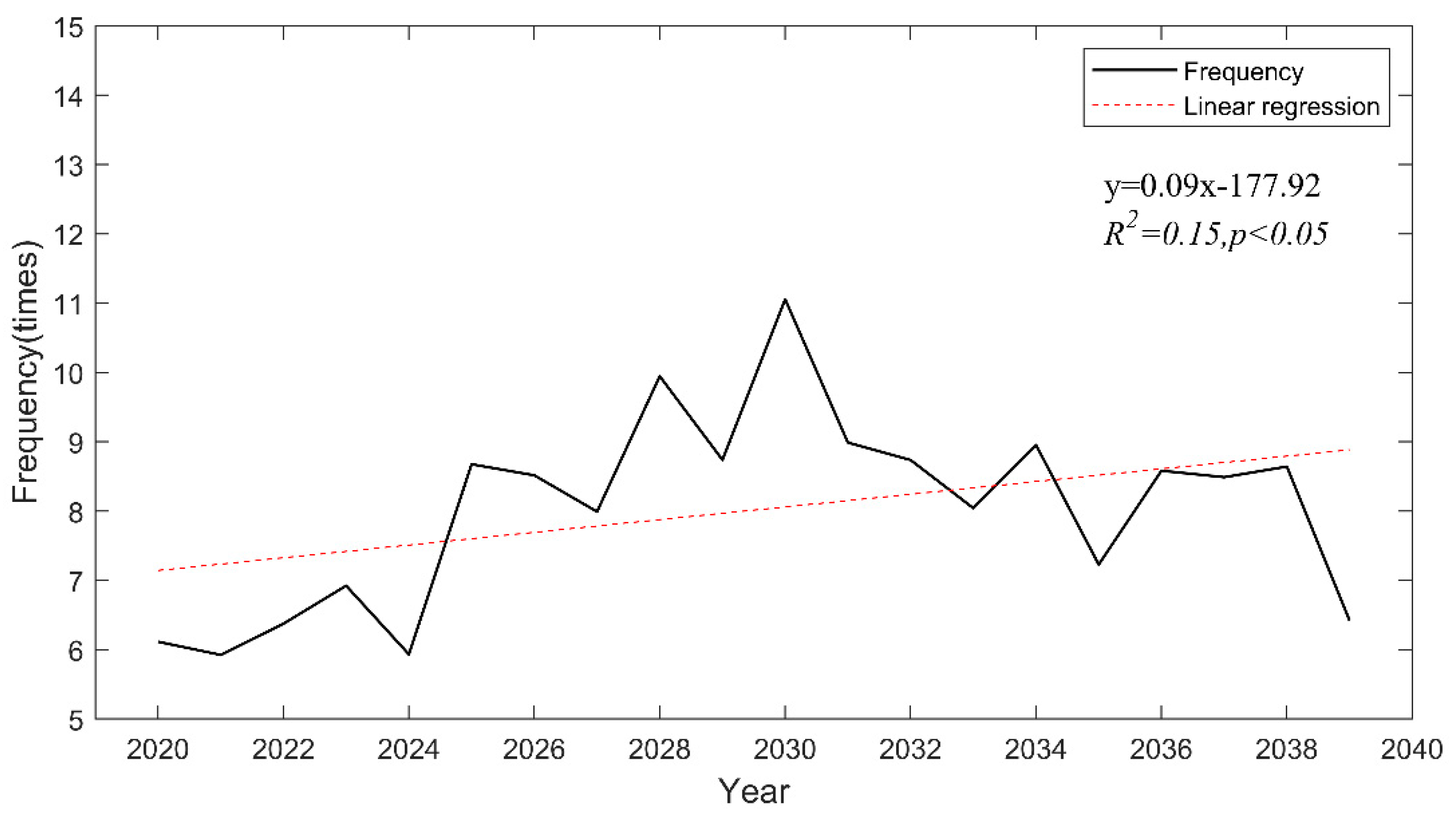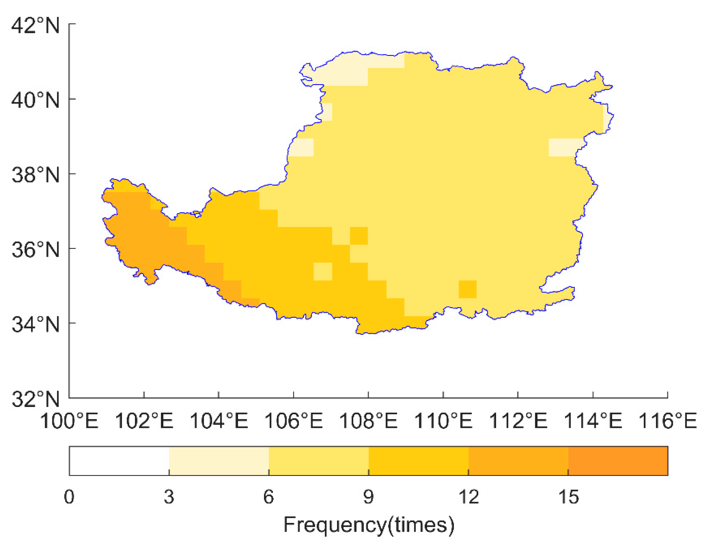 Spatially, the annual frequency of extreme precipitation events for the 1.5 °C global warming level is shown in Figure 4. In the period of 2020–2039, extreme precipitation events are likely to occur most frequently in the southwestern Loess Plateau, (i.e., the eastern parts of Qinghai and Gansu provinces), and the annual frequency is about 12–15 times. Those areas with a lower frequency were mainly concentrated in northern Loess Plateau, (i.e., Inner Mongolia Autonomous Region), the annual frequency is about 3–6 times.