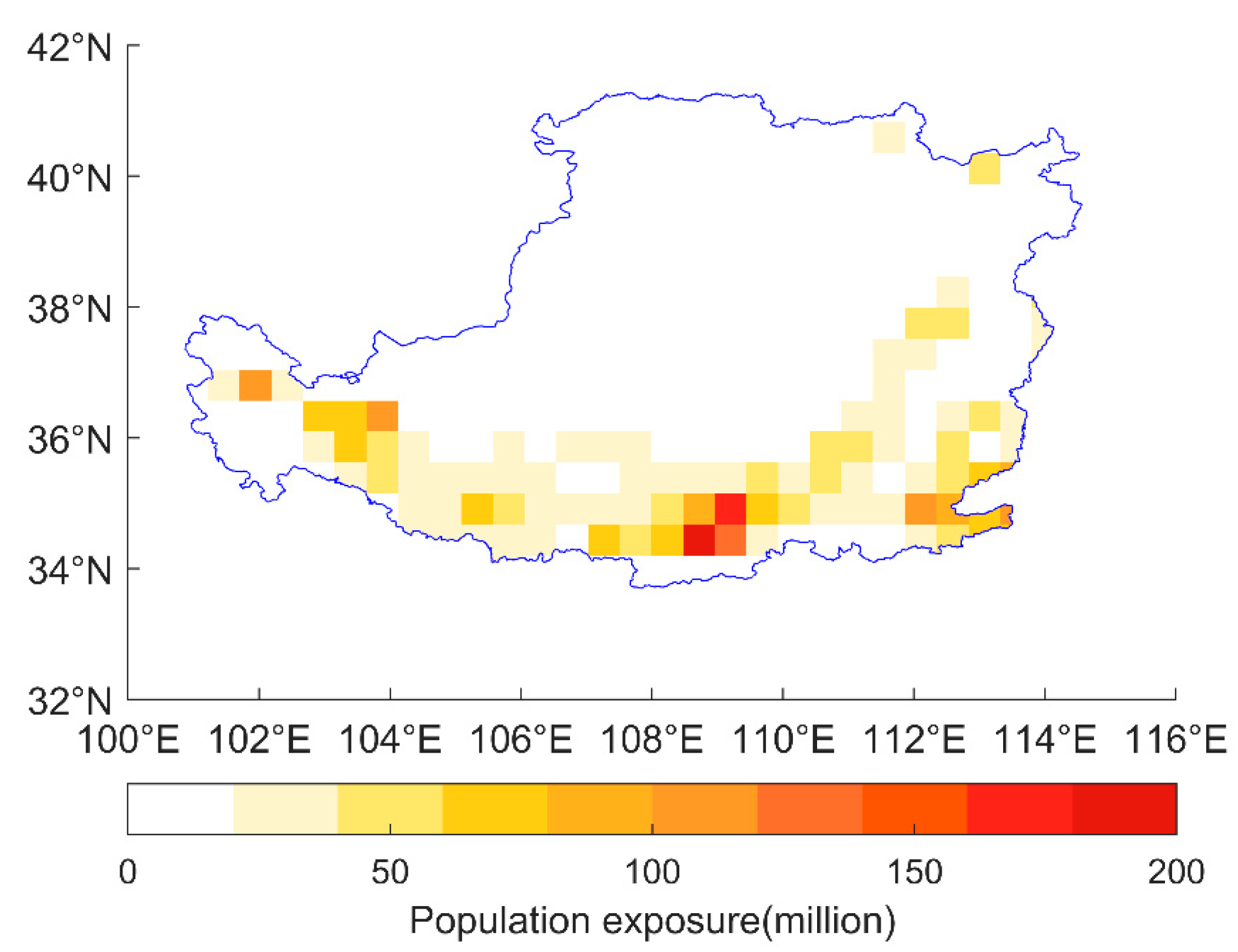 Annual population exposure to extreme precipitation events in the Loess Plateau under the 1.5 °C global warming scenario.