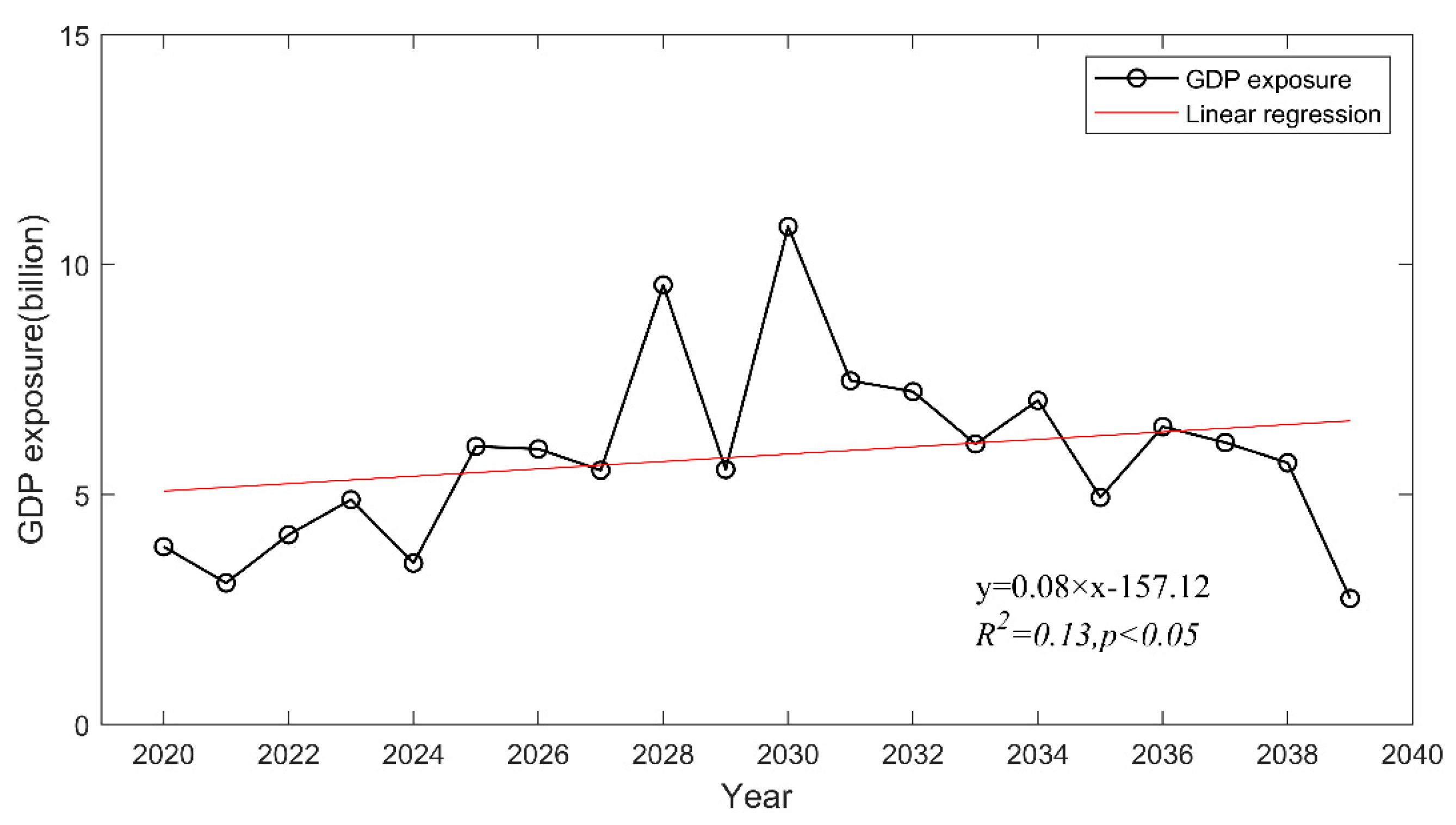 Like the population, the GDP also shows a similar upward trend (Figure 7) with an increase of about USD 0.8 billion per decade. For the 1.5 °C global warming level, the annual GDP exposure ranges from USD 2.9 to 12.3 billion on the Loess Plateau. From 2020 to 2030, GDP exposure is likely to increase and attain its peak in 2030 (i.e., about USD 12.3 billion). GDP exposure is likely to show a decreasing trend from 2030 to 2039, and may reach the lowest value in 2039 (i.e., about USD 2.9 billion).