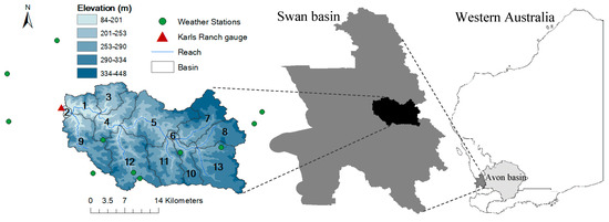 DEM is required by the SWAT model for delineating watershed and generating sub-basins in the Wooroloo Brook catchment (Figure 1). In this study, the DEM data were downloaded from Geoscience Australia (https://elevation.fsdf.org.au/, accessed on 10 July 2019) with a resolution of 30 m by 30 m, and 13 sub-basins were generated (Figure 1). Sub-basin parameters (e.g., slope gradient and channel length) were obtained from DEM.
