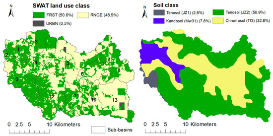 Land use is one of the key factors that impacts evapotranspiration and runoff in a basin [64]. Land use data with a 50 m spatial resolution from ABARES was adopted and reclassified to match the land use classes in the SWAT model (Figure 2) in this study. This data was obtained through the integration of fine-scale satellite data, land tenure, and other kinds of land use information, and information gathered in the field. There were three land use classes in the study area: FRST (forest-mixed), RNGE (range-grasses), and URBN (urban) (Figure 2).