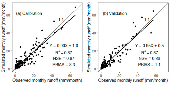 For streamflow calibration, 22 parameters of the SWAT model were calibrated, validated, and ranked for the Wooroloo Brook catchment (Table S2). Global sensitivity analysis in SWAT-CUP was used to rank these parameters based on their sensitivities. The sensitivity analysis indicated that six parameters (ranked 1–6, Table S2) had significant impacts on the calibration of the SWAT model (p ≤ 0.05). In this catchment, the SCS runoff curve number for moisture condition II (CN2) was found to be the most sensitive calibration parameter. The comparison between monthly simulated and observed streamflow during calibration and validation is shown in Figure S1. A visual comparison suggests that the simulations reasonably reproduced the observed streamflow and similarly replicated its temporal fluctuation. Figure 4 indicates that monthly simulated and observed runoff had a high correlation (NSE ≥ 0.86, R2 ≥ 0.87, and |PBIAS| ≤ 8.3%) in model calibration and validation in the Wooroloo Brook catchment.