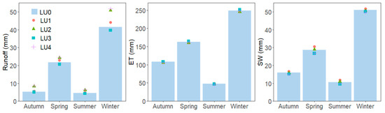 Monthly runoff, actual evapotranspiration, and soil water were simulated using the calibrated SWAT under LU0–4, in 1977–2016, for the Wooroloo Brook catchment. Figure 5 displays the seasonal runoff, ET, and SW under land use 0–4 while Table 3 shows changes in the annual runoff, ET, and SW under LU0–4. There were clear seasonal variations for runoff, ET, and SW, with values greatest in winter (wet season) and least in summer (dry season) (Figure 5). Moreover, in Figure 5, seasonal changes in the runoff under LU1–4 were generally more remarkable than changes in ET and SW, especially in winter. In addition, Figure 5 suggests that seasonal runoff increased under LU1–2 and LU4 (deforestation or urbanization) while it decreased under LU3 (afforestation), and the same result for annual runoff can be found in Table 3. For example, runoff increased by 4 mm (6%) under LU1 (25.3% increase in RNGE from FRST), 17 mm (22.8%) under LU2 (23.8% increase in URBN from FRST), and 18 mm (25.1%) under LU4 (29.5% increase in URBN from RNGE) using the SWAT model. In comparison, a 24.4% increase in FRST area from RNGE (LU3) caused a −3 mm (−4.3%) decrease in runoff. In contrast to runoff, Table 3 shows that the mean annual actual evapotranspiration decreased under LU1–2 and LU4 (deforestation or urbanization) while it increased under LU3 (afforestation). In addition, the percentage changes in annual ET were much smaller than that of runoff under LU1–4 (Table 3). For instance, average annual ET decreased by −6 mm (−1.0%) with a 25.3% decline in FRST (LU1) and increased by 5 mm (0.9%) with a 24.4% increase in FRST area (LU3) using SWAT. Furthermore, mean annual soil water increased by 4.4% under LU1 (25.3% increase in RNGE from FRST) and very little (≤0.2%) under LU2 (23.8% increase in URBN from FRST) while it decreased by −4.2% under LU3 (24.4% increase in FRST from RNGE) and −4.6% under LU4 (29.5% increase in URBN from RNGE) using SWAT.