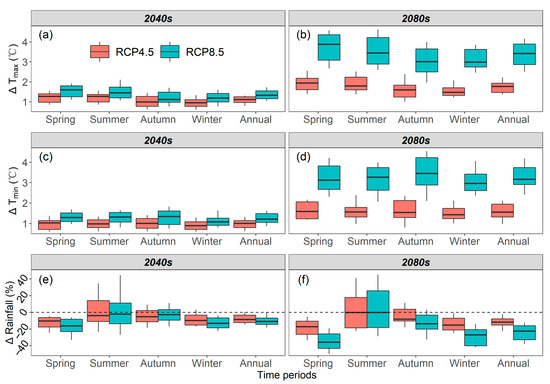 Future temperature and rainfall projections were aggregated to seasonal and annual time scales and compared to baseline values (Figure 6). In this study, all 34 GCMs were in agreement that the temperature would rise in the future, with greater temperature increases in the 2080s than in the 2040s at both seasonal and annual time scales (Figure 6). In addition, higher temperature increases were projected under RCP8.5 than RCP4.5 (Figure 6). Figure 6a,b shows that the seasonal maximum temperature was mainly predicted to increase most in spring in the future while increases were mainly the lowest in winter. For temperature minima (Figure 6c,d), the median estimate exhibited the largest increase mainly in autumn, and the smallest increase in the minimum temperature in winter. The ensemble median increase for the annual maximum temperature was 1.1 °C in 2040s (RCP 4.5), 1.3 °C in 2040s (RCP 8.5), 1.8 °C in 2080s (RCP 4.5), and 3.4 °C in 2080s (RCP 8.5) (Figure 6a,b) while the annual minimum temperature was projected to increase by 1.0 °C in 2040s (RCP 4.5), 1.2 °C in 2040s (RCP 8.5), 1.6 °C in 2080s (RCP 4.5), and 3.2 °C in 2080s (RCP 8.5) (Figure 6c,d).