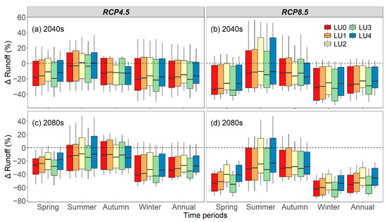 Projected seasonal and annual changes in runoff (%) for LU0−LU4 in the 2040s and 2080s under both RCPs estimated from 34 GCMs compared to the baseline period. Data displayed are changes in the 40−year averages for each of the 34 GCMs. The lower and upper whiskers show the 10th and 90th percentiles; box boundaries show the 25th and 75th percentiles; the black line within each box marks the median values.