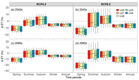 Projected seasonal and annual changes in ET (%) for LU0−LU4 in the 2040s and 2080s under both RCPs estimated from 34 GCMs compared to the baseline period. Data displayed are changes in the 40−year averages for each of the 34 GCMs. The lower and upper whiskers show the 10th and 90th percentiles; box boundaries show the 25th and 75th percentiles; the black line within each box marks the median values.