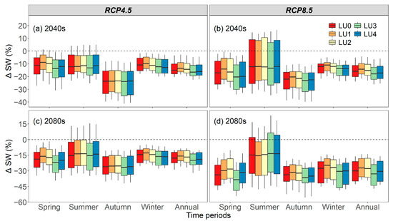 Under different land use change scenarios (LU1–4), projected changes in seasonal and annual runoff, ET, and SW in 2040s and 2080s compared with baseline values under both RCPs from the 34 GCMs are shown in Figure 7, Figure 8 and Figure 9. According to the ensemble median of the 34 GCMs, the results of the four land use change scenarios (LU1–4) were only slightly different from the responses to LU0 (Figure 7, Figure 8 and Figure 9). For instance, the ensemble median under LU2 (23.8% increase in URBN from FRST) and LU4 (29.5% increase in URBN from RNGE) showed slightly smaller annual runoff decrease than other land use scenarios (Figure 7). In addition, the ensemble median under LU3 (24.4% increase in FRST from RNGE) generally suggested a marginally less annual ET decrease than other land use scenarios (Figure 8). Furthermore, the annual soil water decrease was slightly less under LU1 (25.3% increase in RNGE from FRST) and slightly larger under LU3 (24.4% increase in FRST from RNGE) than other land use scenarios, according to the ensemble median of the 34 GCMs (Figure 9).
