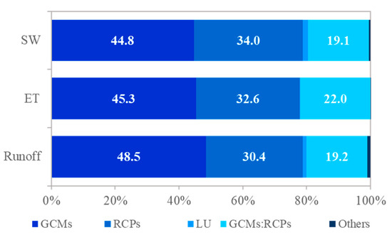 To quantify the contribution of GCM, RCP, and LU to the uncertainty in future changes in the water balance, the ANOVA method was used and the results are presented in Figure 10. The ANOVA shows that GCMs have the greatest contribution to uncertainty, followed by RCPs, and the land use scenarios have the least contribution to future changes in runoff, ET, and SW. For instance, ANOVA (Figure 10) shows a 48.5% influence of the GCM, followed by RCP (30.4%), whereas LU had a negligible impact of 1.08% on changes in runoff.